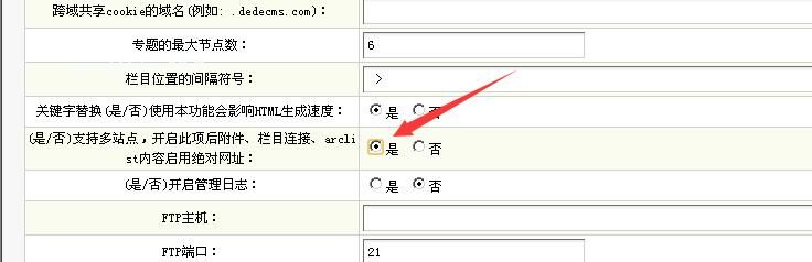 3:開啟--> (是/否)支持多站點,開啟此項后附件、欄目連接、arclist內容啟用絕對網址