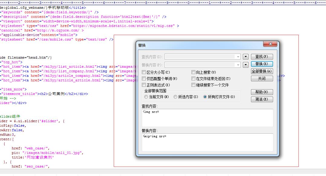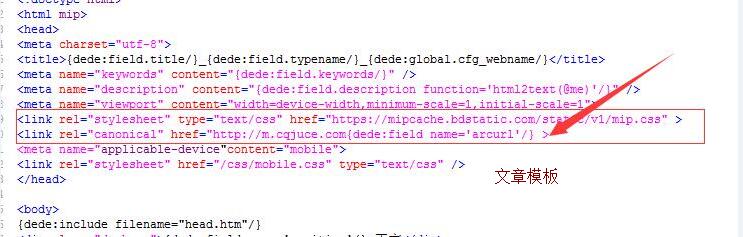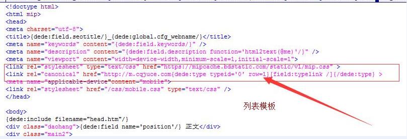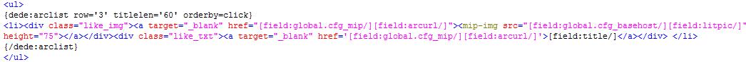 8、a標簽替換:因mip改造必須是絕對路徑,所以把所有a標簽改成絕對路徑,方法:在鏈接前加{dede:global.cfg_mip/}(在全局內使用)或[field:global.cfg_mip/](在{dede:arclist}內使用),例:<a target="_blank" href="[field:global.cfg_mip/][field:arcurl/]">