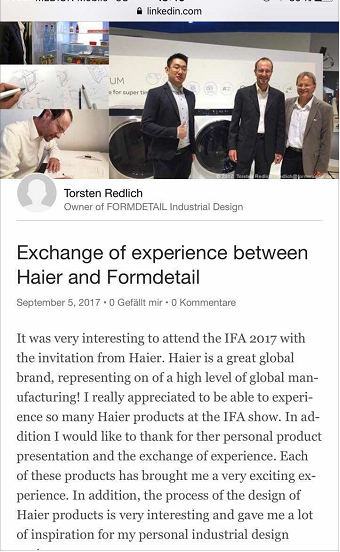 事實上,Torsten Redlich不止是海爾新晉用戶,更稱海爾為“創意老師”:這從他在全球領先的職業社交平臺LinkedIn對海爾的贊美便可印證。Torsten Redlich在其LinkedIn賬號發布與海爾智慧家電的“自拍”,并稱“海爾是一個非常棒的全球化品牌,代表全球制造業最高水平!很高興能夠在IFA展上體驗到如此多的海爾產品,每一款產品都給我帶來了非常震撼的使用體驗。海爾產品的工藝設計非常巧妙,給了我我很多靈感,接下來我將會這些靈感應用到我的最新設計中。”