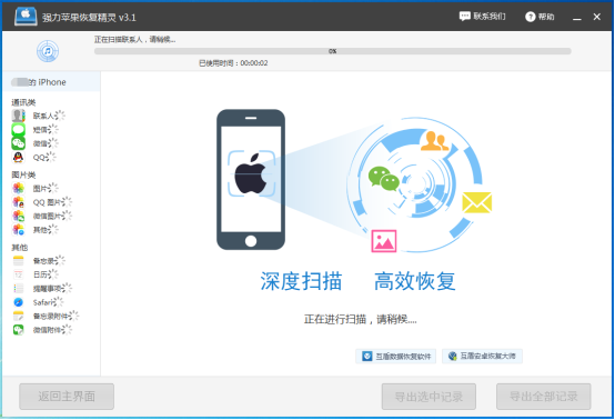 3、軟件開始掃描手機數據,本次掃描的數據有三大類,總共有十四種之多,這里可以看出這款軟件的高效能了,掃描完這些的數據需要必然的時間,請耐心等待。