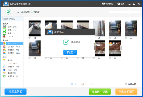 4、掃描結束之后,在左側找到“圖片”一欄點擊,旁邊出現有具體的圖片信息,在其中找到之前誤刪除的那些勾選上,隨后點擊“導出選中記錄”按鈕。軟件就開始恢復操作了。