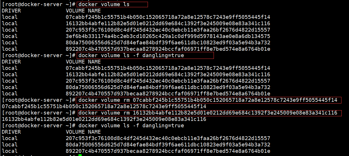 docker volume ls #查看數(shù)據(jù)盤 docker volume ls -f dangling=true #查看未被容器使用的數(shù)據(jù)盤 docker volume rm VOLUME NAME #刪除數(shù)據(jù)盤
