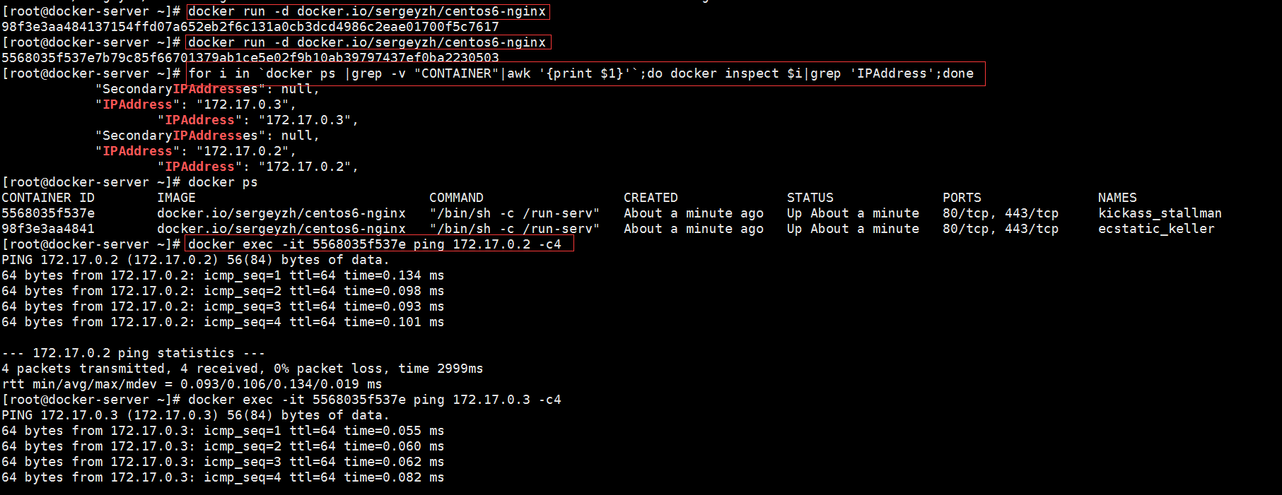 啟動(dòng)兩個(gè)容器,查看其容器內(nèi)部IP地址