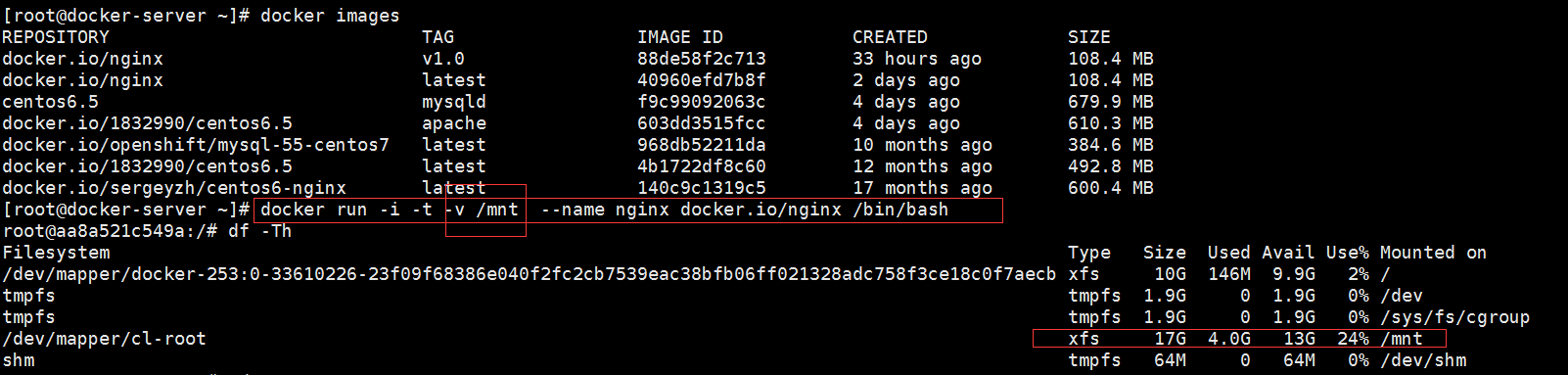 docker run -i -t -v /mnt --name nginx docker.io/nginx /bin/bash