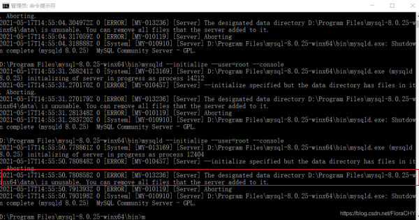 這里需要注意的一點,如果data文件不為空,則會報錯:The designated data directory D:\Program Files\mysql-8.0.25-winx64\data\ is unusable. You can remove all files that the server added to it.