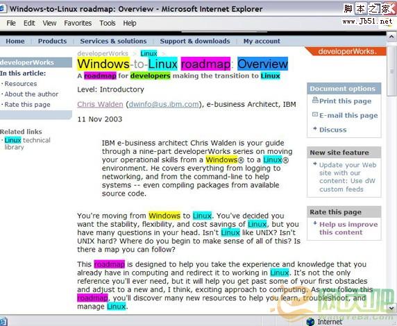 我將以 developerWorks Windows to Linux Roadmap 概述頁面(www.ibm.com/developerworks/linux/library/l-roadmap.html)為例。這個(gè)路線圖用來幫助那些希望從 Windows 遷移到 Linux 的開發(fā)人員,概述頁面針對(duì)開發(fā)人員可能搜索的單詞做了廣泛的優(yōu)化。我突出顯示了在頂部標(biāo)記和前 200 個(gè)單詞中出現(xiàn)的關(guān)鍵詞。