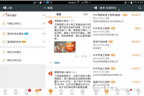 打開獵聘同道APP,可以看到發現、職位、消息、人脈、我五大功能模塊,溝通無處不在,發現頻道有最新的人才資訊動態與問答,可實時獲取行業資訊,既能方便分享到各種社會化媒體,也可以快速進行點贊及評論解答,職位模塊里可以按照不同的條件搜索各種職位,消息模塊里有企業及獵頭發給你的最新實時消息,人脈頻道里可以搜索添加各種好友,查找關注的獵頭及企業,發現更多職業機會。我頻道里有各種隱私設置、簡歷設置及應聘記錄。
